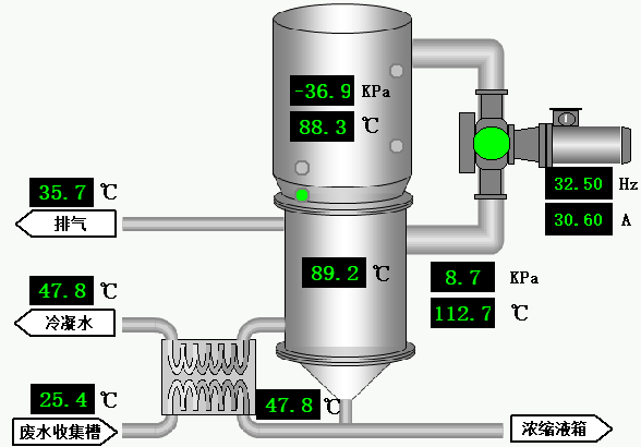 ③ 蒸發罐內為-35至55KPA(可設定)負壓條件運行,污水升溫至80-90攝氏度開始沸騰,產生大量水蒸汽。